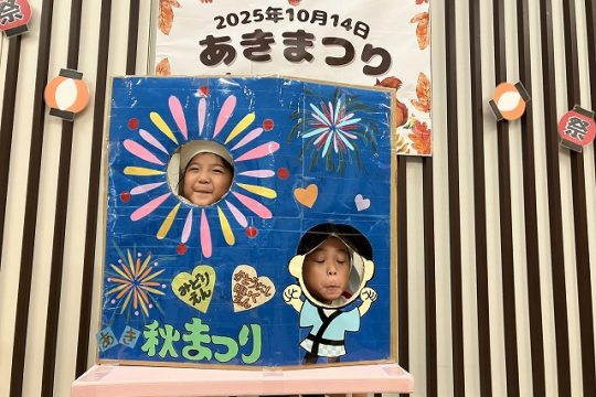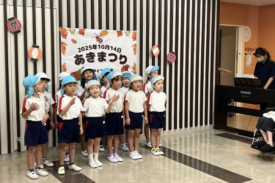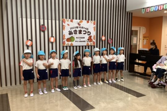 特別養護老人ホームみどり苑宗像の秋まつりに参加しました。保育園から子どもたちと歩いてみどり苑さんに行きました。到着するとまずは、おじいちゃんやおばあちゃんに『やまのおんがくか』『さんぽ』の歌のプレゼントしました。少し緊張していた子どもたちでしたが、歌い終わるとたくさんの拍手に嬉しそうな様子でした。