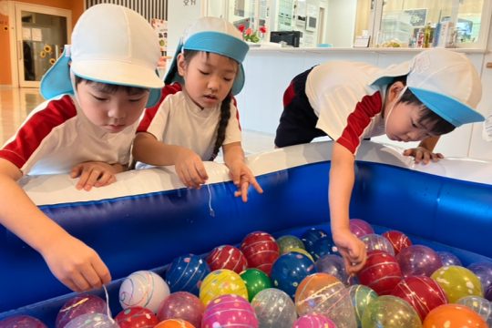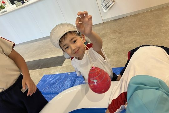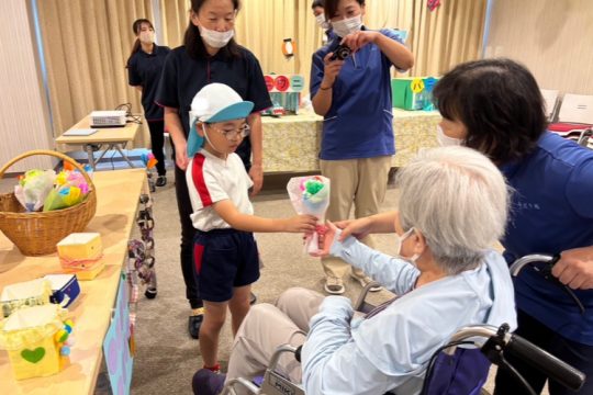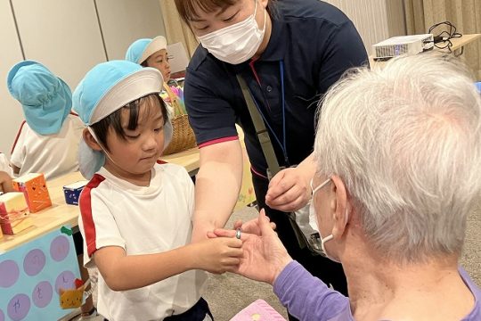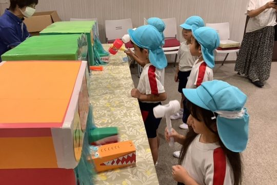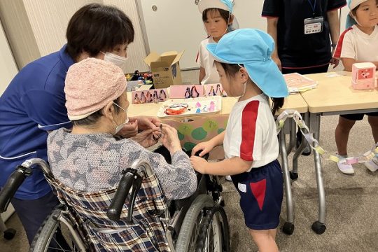 その後は、子どもたちが作ったブレスレットや小物入れ、花束を持って行ってお店屋さんをしました。自分が作った物が売れると嬉しそうにする姿が見られました。おじいちゃんやおばあちゃんと優しく触れ合い、会話を楽しむなど思いやりのある姿も見られました。また、みどり苑さんが用意してくださったゲームコーナーではヨーヨー釣りやワニワニパニックに夢中になり楽しんでいました。楽しすぎて保育園に帰るとさっそく、廃材でワニワニパニックを作る様子も見られました。