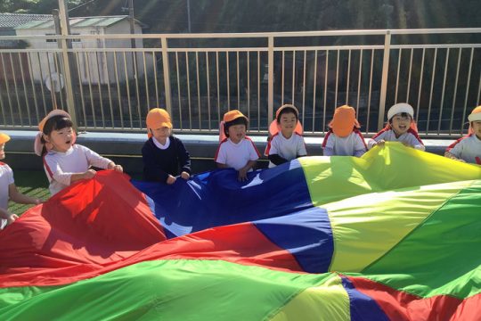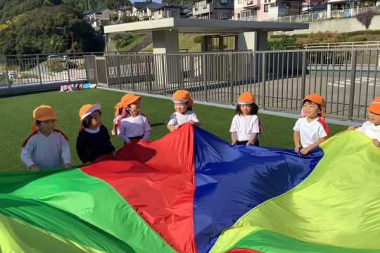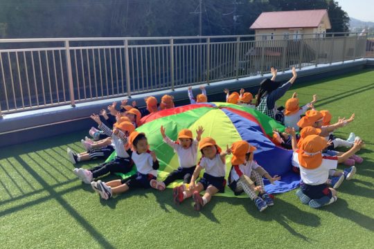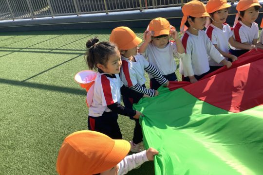 くま組(4歳児)が運動会でしたバルーンに憧れているので、少し小さめのバルーンを購入してもらい遊びました。芝生広場に広げると「わー!」「おおきい」と嬉しそうな声が上がりました。上下に振って波を作ったり、1・2の3で上げて膨らませたりして楽しみました!とても上手にできて大満足のぱんだ組(3歳児)みんなは、バルーンの虜です♡