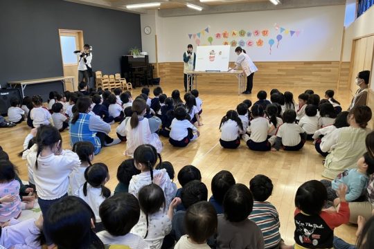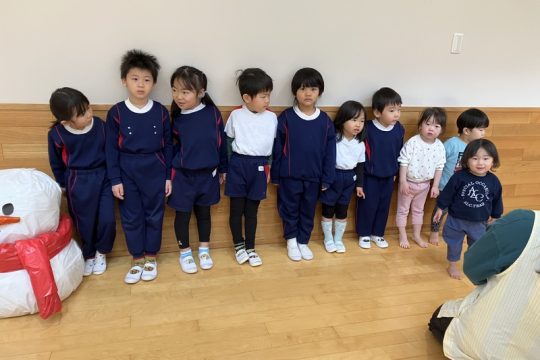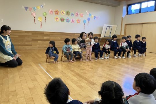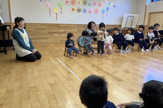インタビューの後は、「ハッピーバースデートゥーユー」と「ゆき」の歌を歌い、お誕生者のお友だちをお祝いしました。元気いっぱいの明るい声で歌ってくれたので、お誕生者のお友だちへ素敵な歌のプレゼントになりました。先生からの出し物のプレゼントは「てぶくろ」のお話のパネルシアターでした。色々な動物が出てくるお話だったので、興味津々で最後までお話を聞き楽しい時間を過ごしました。