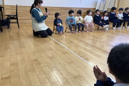 りす組のお友だちは、お名前を呼んでもらい上手にお返事をして、先生と一緒に好きな遊びを教えてくれました。