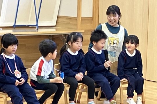 ぱんだ組、くま組、らいおん組のお友だちは、自分の名前と年齢、将来の夢を教えてくれました。同じクラスのお友だちから「おめでとう」とメダルを貰い、とても嬉しそうにしていました。